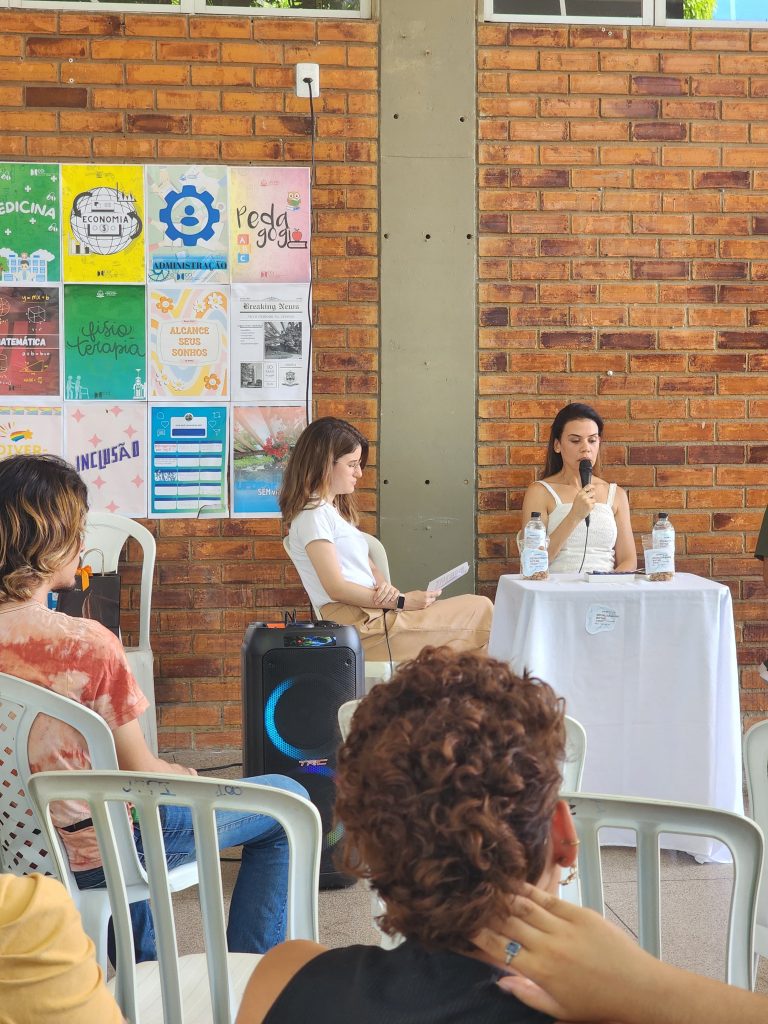 Aceitamos o desafio e optamos justamente pela temática da desistência, abordando a mudança de rota e tratando- a como parte intrínseca e natural do ambiente acadêmico e da vida. A partir da nossa realidade, pensamos estrategicamente e veio a ideia central do dia do evento: uma roda de conversa e o lugar perfeito seria na frente do nosso auditório central, perto da hora do almoço- é um local com grande fluxo de pessoas nesse horário. Assim alcançaríamos muitos e diferentes grupos da nossa comunidade. Depois de refletir bastante, decidimos também nossos convidados, a professora Loredana, do curso de biomedicina e o nosso assessor regional, Rui.